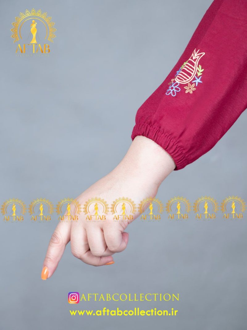 جلوی کار بسته میباشد/بالای سینه و سرآستین گلدوزی شده است(طرحگلدان/بته جقه)