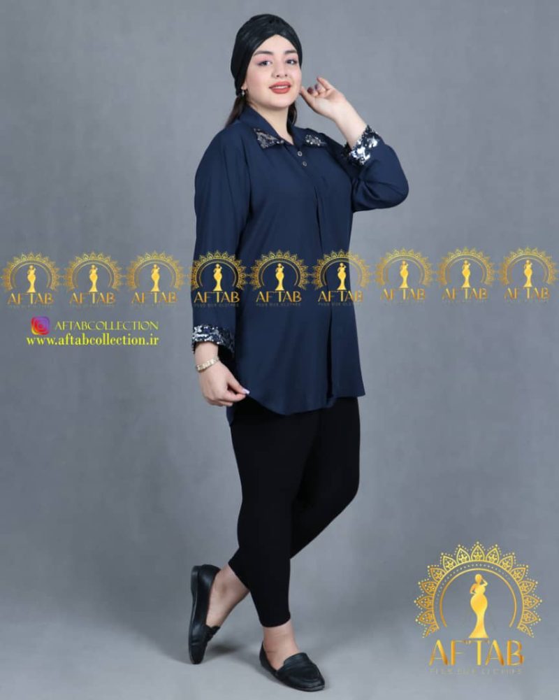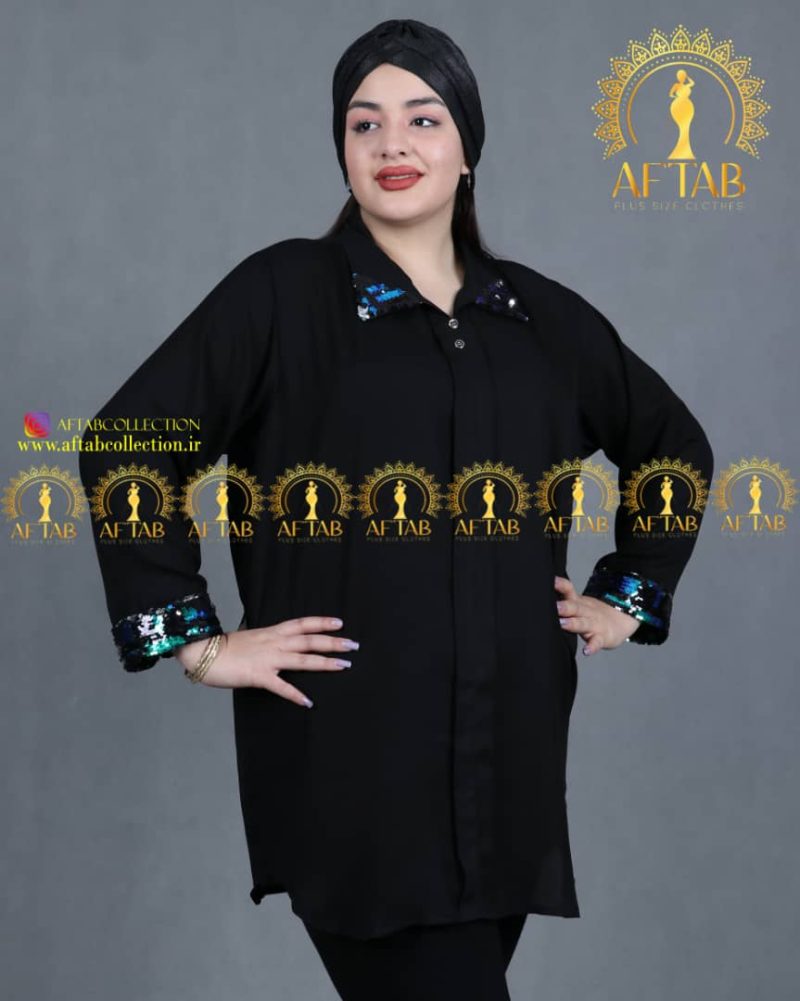 شومیز مجلسی خرجکار پولکی سایز بزرگ تولید شده با پارچه کرپ حریر و استفاده از خرجکار پولکی در قسمت یقه و سر آستین